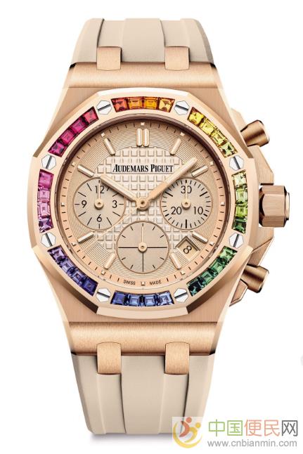 爱彼皇家橡树离岸型系列26236OR.YY.D085CA.01腕表,对于绝大多数女性和手腕较细的男性而言,常规42、44毫米的皇家橡树离岸型系列腕表可能不太好驾驭中.国.便.民.网。而37毫米就对这部分消费者友善了很多。这枚37毫米直径大小的“彩虹圈”采用18K玫瑰金表壳,搭配防眩光处理蓝宝石水晶玻璃表镜,镶嵌“彩虹色”长方形切割蓝宝石的表圈。宝石按照渐变颜色排列,32颗长方形切割“彩虹色”蓝宝石,总重约2.45克拉(表圈)中+国+便+民+网。不一样的彩虹圈,藏在在精致的细节之中。烟熏玫瑰金色表盘镌刻 “Lady Tapisserie”格纹装饰,搭配玫瑰金色副表盘,玫瑰金荧光立体时标和皇家橡树指针。18K玫瑰金表壳和橡胶材质的表带中+国+便+民+网。表壳直径为37毫米,表壳厚度控制在12.4毫米左右,在手腕上不至于没有存在感,却也不会给佩戴者带来太大负担。18K玫瑰金按钮和旋入式表冠。米色橡胶表带搭配18K玫瑰金AP字样折叠表扣中~国~便~民~网。这枚全新的皇家橡树离岸型腕表搭载品牌自制的Calibre 2385自动上链机芯 ,具备40小时动力储存和50米的防水深度。同时具备计时功能,小时,分钟,小秒钟及日期显示等功能。总结:这枚爱彼皇家橡树离岸型系列自动上链计时码表彩虹圈的国内售价为516,000元,并已登陆国内各大门店c n b i a n m i n c o m。想要把彩虹握在自己的手中?不妨把这枚彩虹圈带回家。