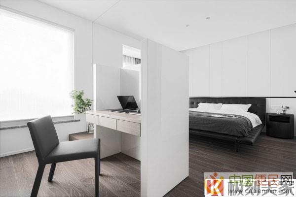 父母房的房门,通过整面白色实木墙板的分割交接,以及黑色不锈钢线条压边去弱化存在,是线的律动也是面的虚化。吊顶灯光抛弃传统混乱的点状的射灯,将灯源归结至磁吸轨道灯与暗藏反光灯槽,使整个顶更加干净,见光不见灯cnbianmin.com。