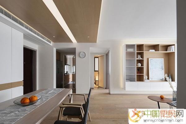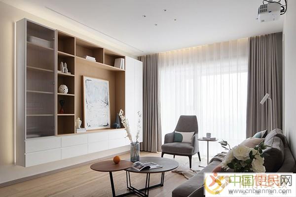 客厅没有做传统的电视背景墙,用了一个收纳柜的形式,作为客厅的一个视觉点。投影幕布在吊顶前做了预埋,完美的融合在吊顶里。柜子用了三种不同的材质来增加设计的层次感来源www.cnbianmin.com。