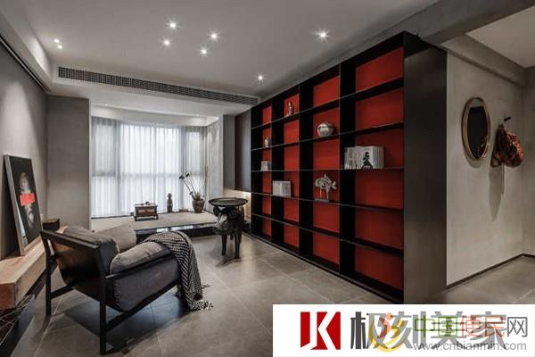 书柜使用钢板现场焊接刷黑色漆而成的整面的书柜最大程度的满足书籍收纳的要求红色背景为整个灰色空间增添了一点传统的气质