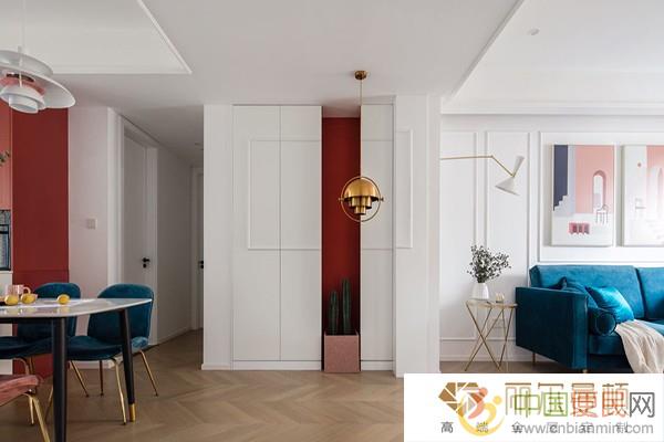 卧,延续温柔轻奢风,以蓝红白作空间主色调,打造浪漫一角,背景墙局部采用墨蓝色系,通过主米褐色与金属元素点缀来源www.cnbianmin.com。