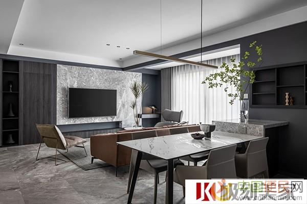餐厅增加岛台设计,增加空间层次感。大理石台面搭配皮质餐椅与不同灰度的简洁背景墙一起营造出简约放松的氛围c_n_b_i_a_n_m_i_n_c_o_m。岛台区域也是第二处可供他们灵活办公的区域,与阳台工作区域相呼应。