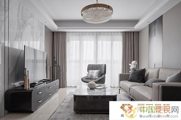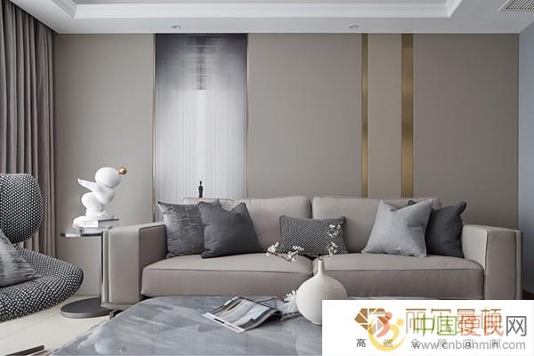 电视背景墙做了改动,为了和旁边的隐形门相搭配,做了金属线条的镶嵌,搭配极简的金属摆件,使空间显得前卫摩登中国便民网。