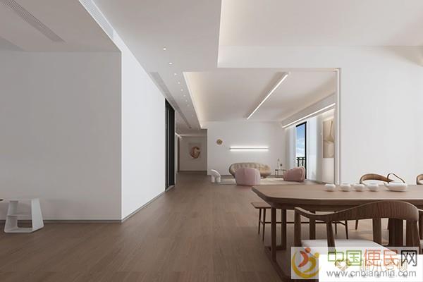 木色长餐桌,色泽温润,简约特别,餐椅线条干净轻盈;木饰面点缀白墙边缘流露的光线营造氛围
